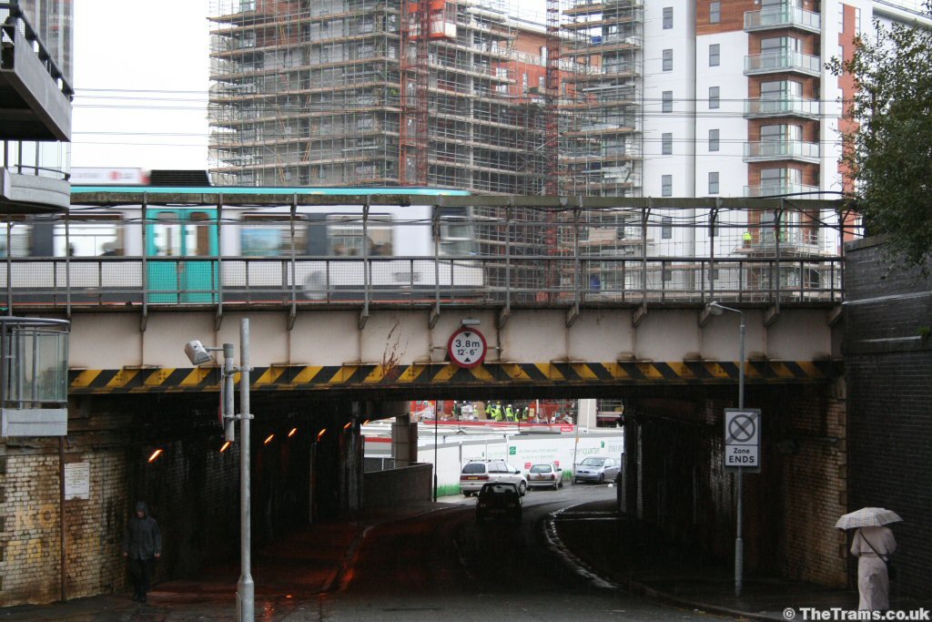 North of Victoria station, Metrolink runs along the mainline railway viaduct which also carries the Manchester–Rochdale main line railway. This is the bridge over the road named Red Bank; the area on the other side of the bridge is is also known as Red Bank. This is another area of Manchester which is seeing heavy redevelopment, as can be seen in this picture