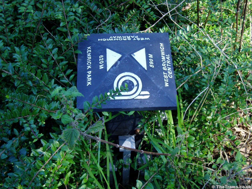 This waymarker sits alongside the line just north of Trinity Way stop. Between Kenrick Park and Guns Village, the two tracks of the tramway share a former 4-track railway formation with a public footpath, the 'West Bromwich Parkway'